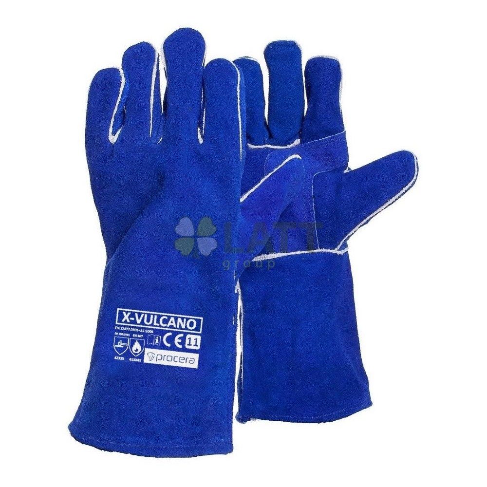 Kožené rukavice X-VULCANO z hovězí štípenky v modré barvě. Úchopová část je vyrobena z jednoho kusu štípenky, zadní část s manžetou je vyrobena z jednoho kusu kůže. V úchopové části vyztužena dvojitou vrstvou kůže. Rukavice zakončené podšívkou. Roh. II, EN388:2016, EN:407:2004, EN:12477:2001+A1:2005 Délka 35cm. Balení: karton 12/72. Modrá barva. Velikost 11
