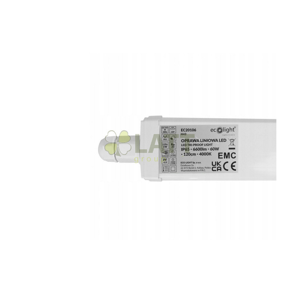 Hermetické lineární LED svítidlo ECO LIGHT 120 cm 60W 6600lm 4000K IP65 je účinný, vysoce výkonný světelný zdroj s vysokou odolností vůči vnějším vlivům. Je určeno pro prostory vyžadující spolehlivé a rovnoměrné osvětlení.