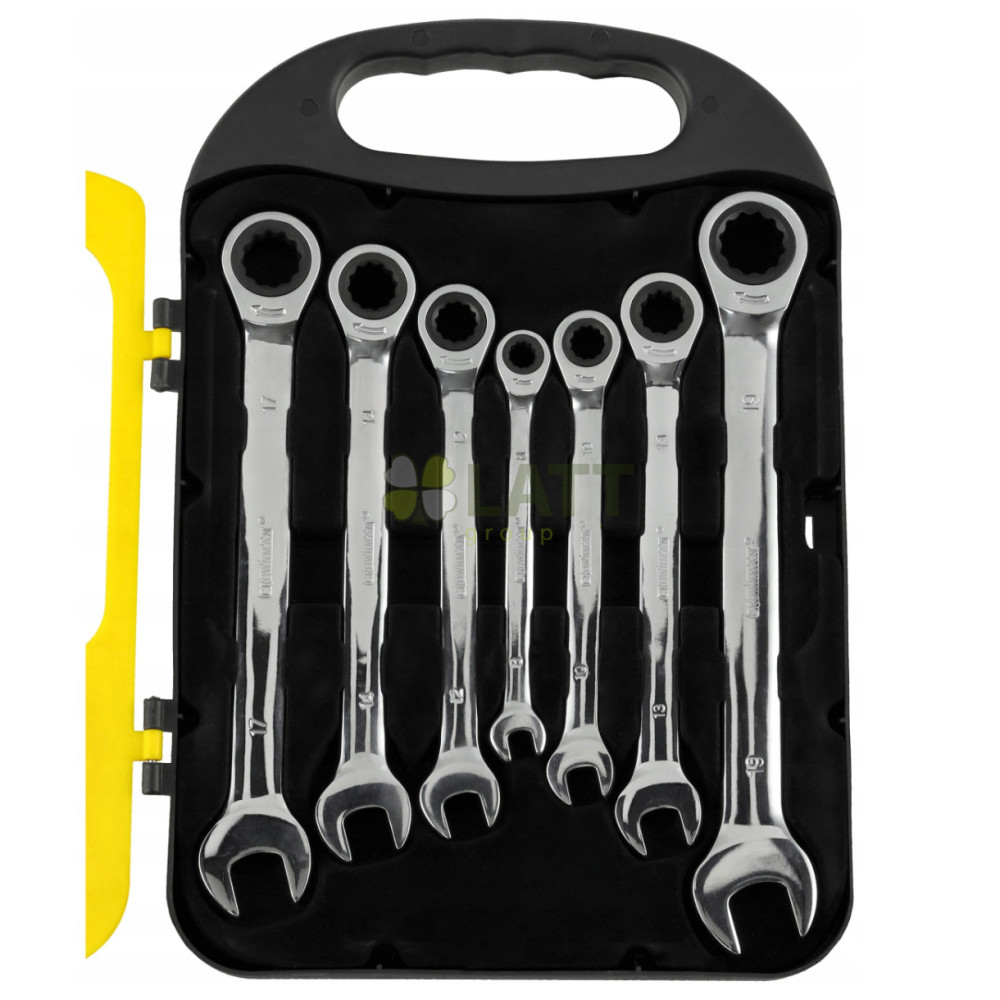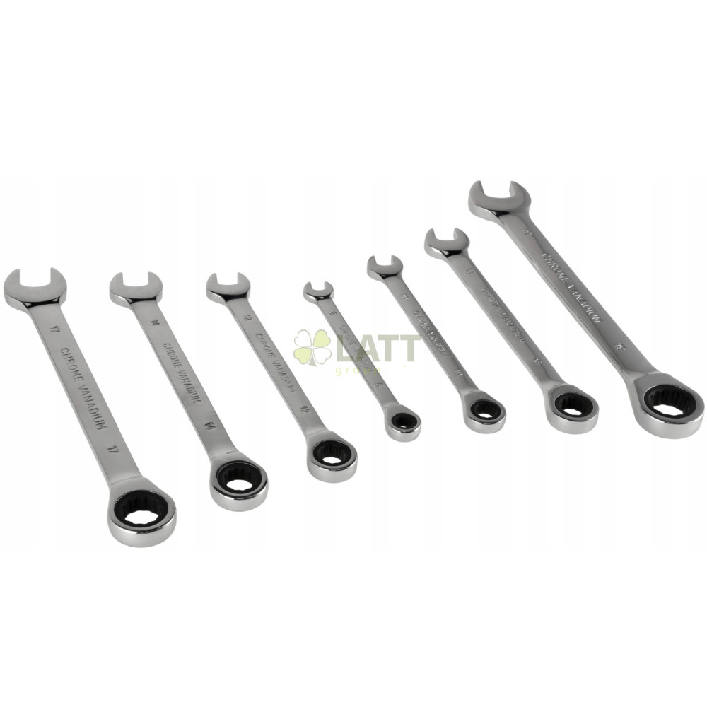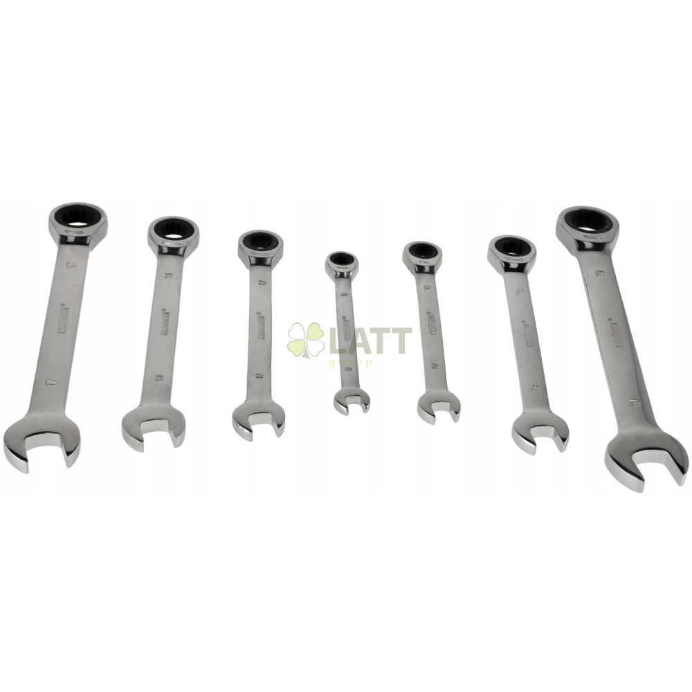 7dílná sada ráčnových otevřených klíčů (8 mm - 19 mm) - odolná a přesná sada pro profesionály a kutily, ideální pro práci na těžko dostupných místech.