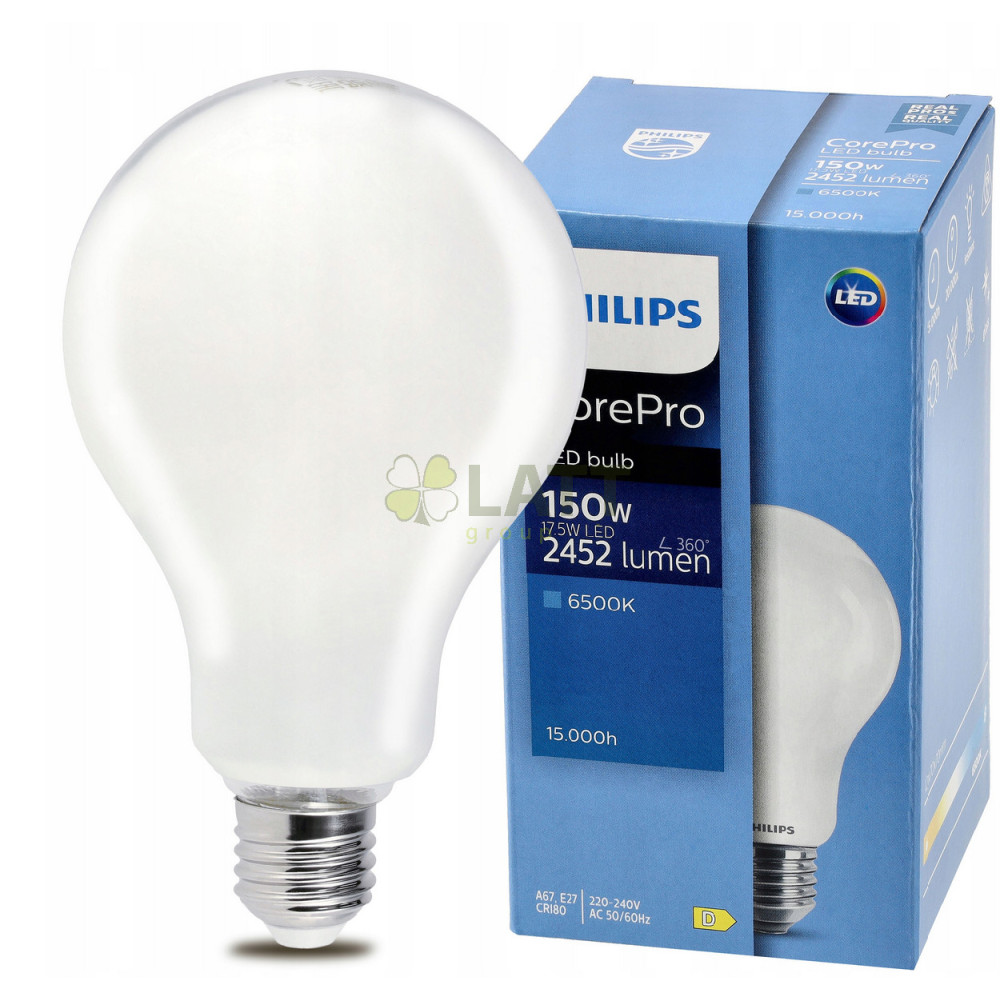 Žárovka PHILIPS CorePro Premium A67 nabízí 2 452 lm , což odpovídá tradiční 150 W žárovce, se spotřebou energie pouze 17,5 W. Díky tomu je ideální pro efektivní osvětlení velkých prostor a poskytuje jasné a rovnoměrné světlo.