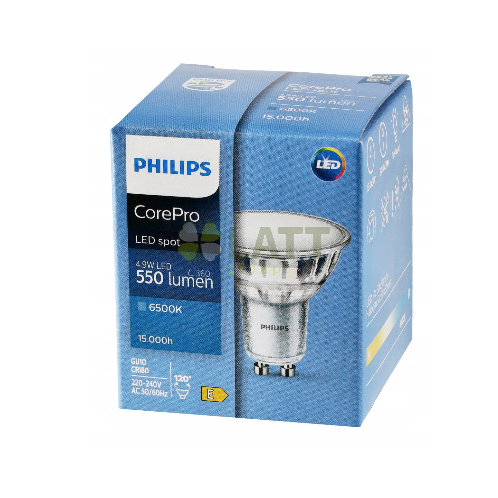 Technické parametry:LED technologieCorePro Zacházet sGU10 Světlá barva6500K – studená bílá Světelný tok: 550 lm Světelná účinnost: 112 lm/W Spotřeba energie: 4,9 W Napájecí napětí: 220–240 V Úhel paprsku: 120° CRI (Ra): ≥80 Doba spuštění<0,5 s Cykly zapnutí/vypnutí50 000 Trvanlivost15 000 hodin Účiník: 0,5 Tvar bublinyPAR16 Rozměry: Ø50 mm x 54 mm Váhy45 g ZatemněníNE Třída energetické účinnostiE Spotřeba energie: 5 kWh / 1000 h RoHSAno ✨Sada 3 kusů! |