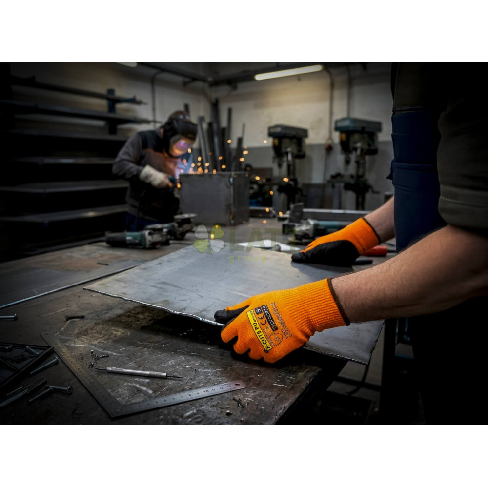 Rukavice X-CUT5 vyrobené ze směsi vláken HPPE a skleněných vláken s vysokým stupněm odolnosti proti proříznutí, potažené polyuretanem. Ideální pro manuální práci. Velmi dobrý pocit z drženého objektu. Chrání před ostrými předměty. Odolnost proti oděru, roztržení a propíchnutí. Dobře se přizpůsobí tvaru ruky. Ukončeno lemem. Vysoký pracovní komfort. CE EN 388:2003 4543, EN 388:2016 4X43D. Balení: karton 12/120. Barva: šedá / šedá.