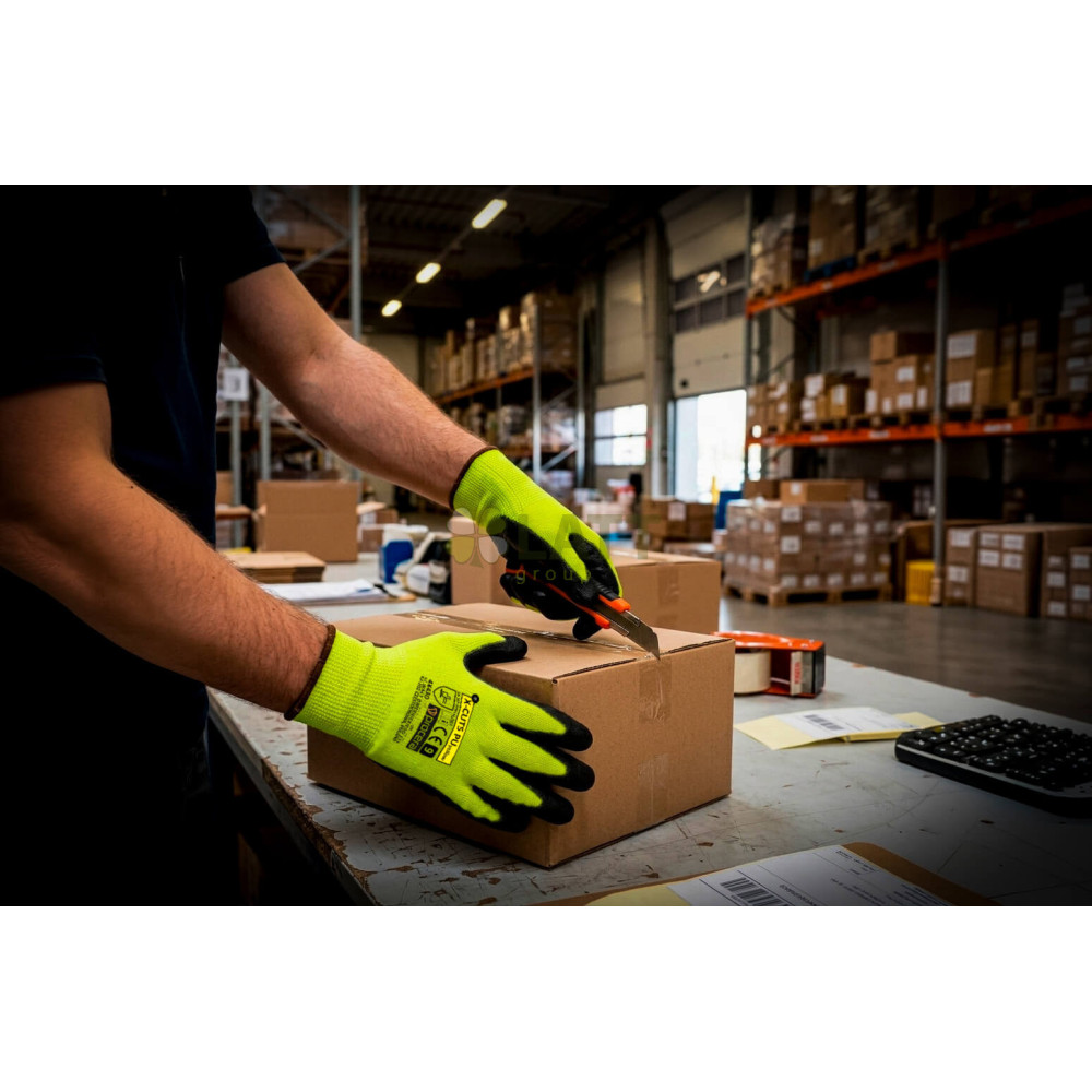Rukavice X-CUT5 vyrobené ze směsi vláken HPPE a skleněných vláken s vysokým stupněm odolnosti proti proříznutí, potažené polyuretanem. Ideální pro manuální práci. Velmi dobrý pocit z drženého objektu. Chrání před ostrými předměty. Odolnost proti oděru, roztržení a propíchnutí. Dobře se přizpůsobí tvaru ruky. Ukončeno lemem. Vysoký pracovní komfort. CE EN 388:2003 4543, EN 388:2016 4X43D. Balení: karton 12/120. Barva: žlutá