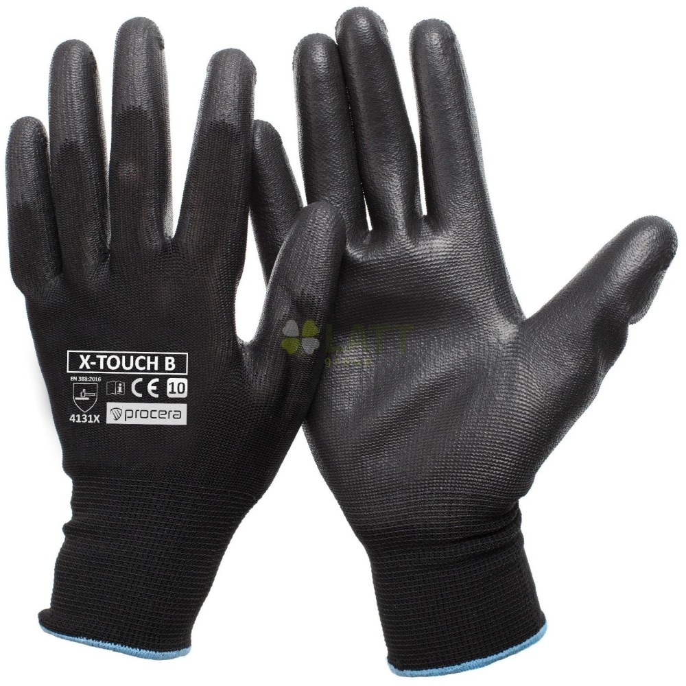 Rukavice X-TOUCH BLACK vyrobené z polyesteru, potažené v úchopové části polyuretanem. Ideální pro manuální práci. Velmi dobrý pocit z drženého objektu. Dobře se přizpůsobí tvaru ruky. Pružné a elastické. Zakončené lemem. CE EN 388. Balení: karton 12/240. Barva: černá/černá.