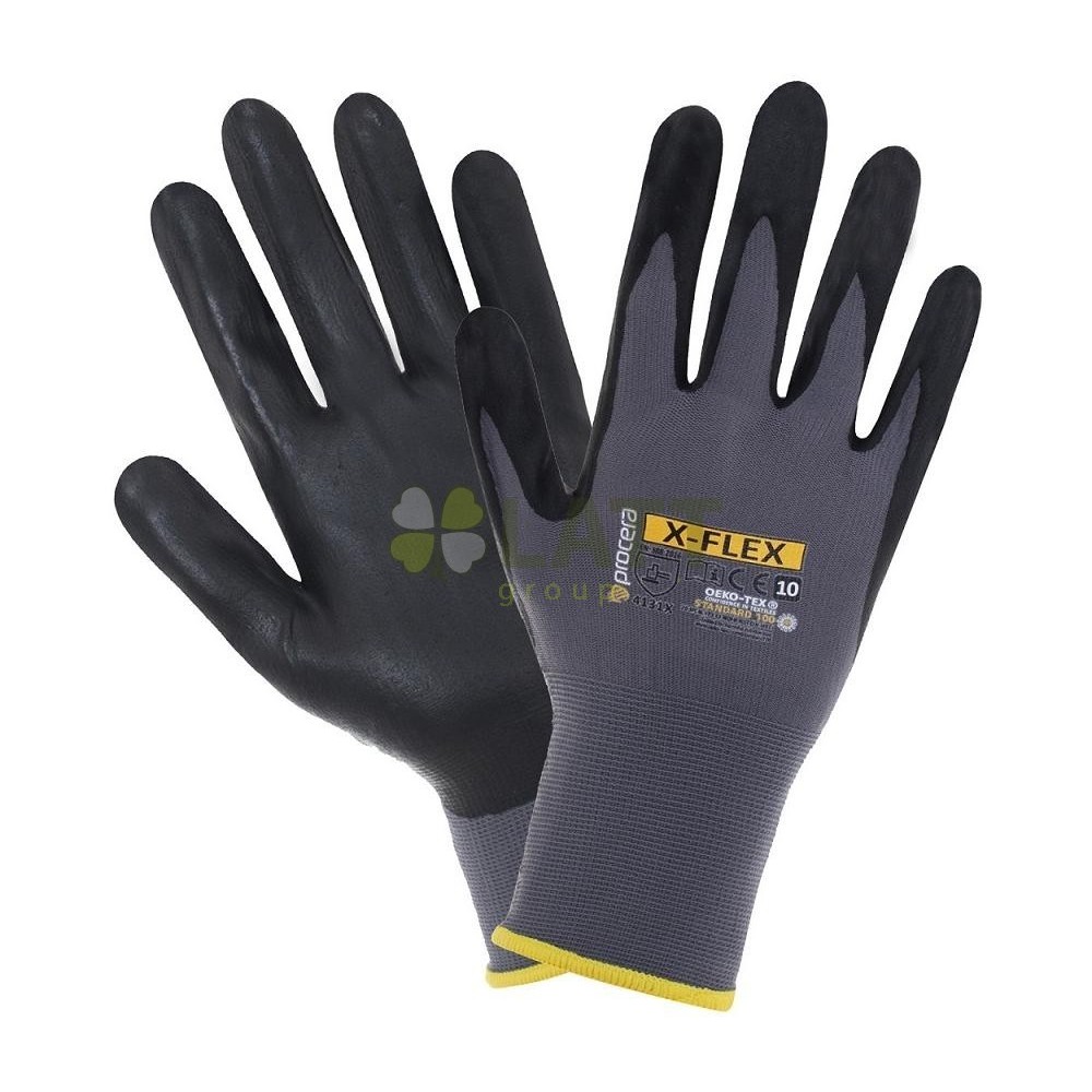 Ochranné rukavice X-FLEX z nylonu a polyesteru s přídavkem lycry, potažené v úchopové části pěnovým nitrilem. Perfektní přizpůsobení a flexibilita, prodyšné, certifikát "OEKO-TEX" Standard 100 potvrzující nepřítomnost škodlivých látek, díky čemuž zaručují vysoký komfort používání. Každý pár balen v samostatném sáčku. CE EN 21420:2020 CE EN 388:2016+A1:2018. Velikosti: 8-11. Balení: karton 12/240.