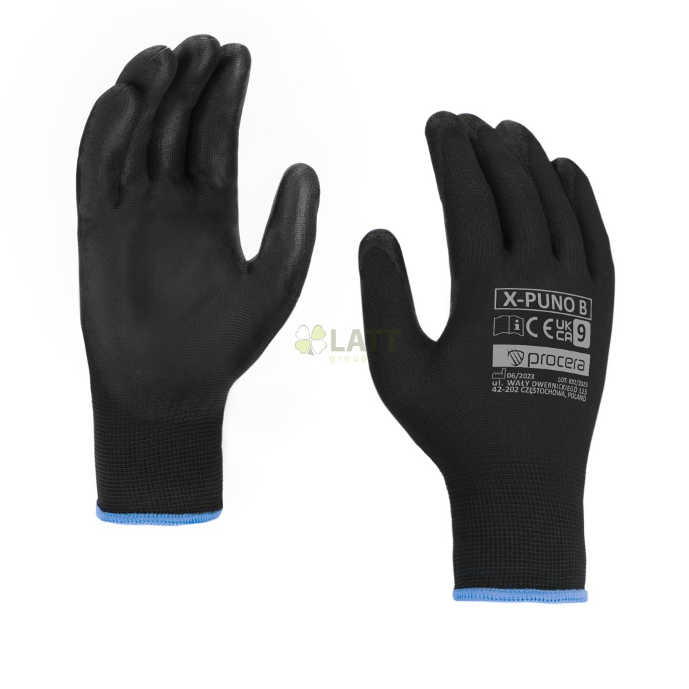 Rukavice X-PUNO BLACK vyrobené z polyesteru, potažené v úchopové části polyuretanem. Ideální pro manuální práci. Velmi dobrý pocit z drženého objektu. Dobře se přizpůsobí tvaru ruky. Pružné a elastické. Ukončené lemem. Kategorie I .Balení: karton 12/240. Černá barva. Dostupné ve velikostech: 6, 7, 8, 9, 10, 11.