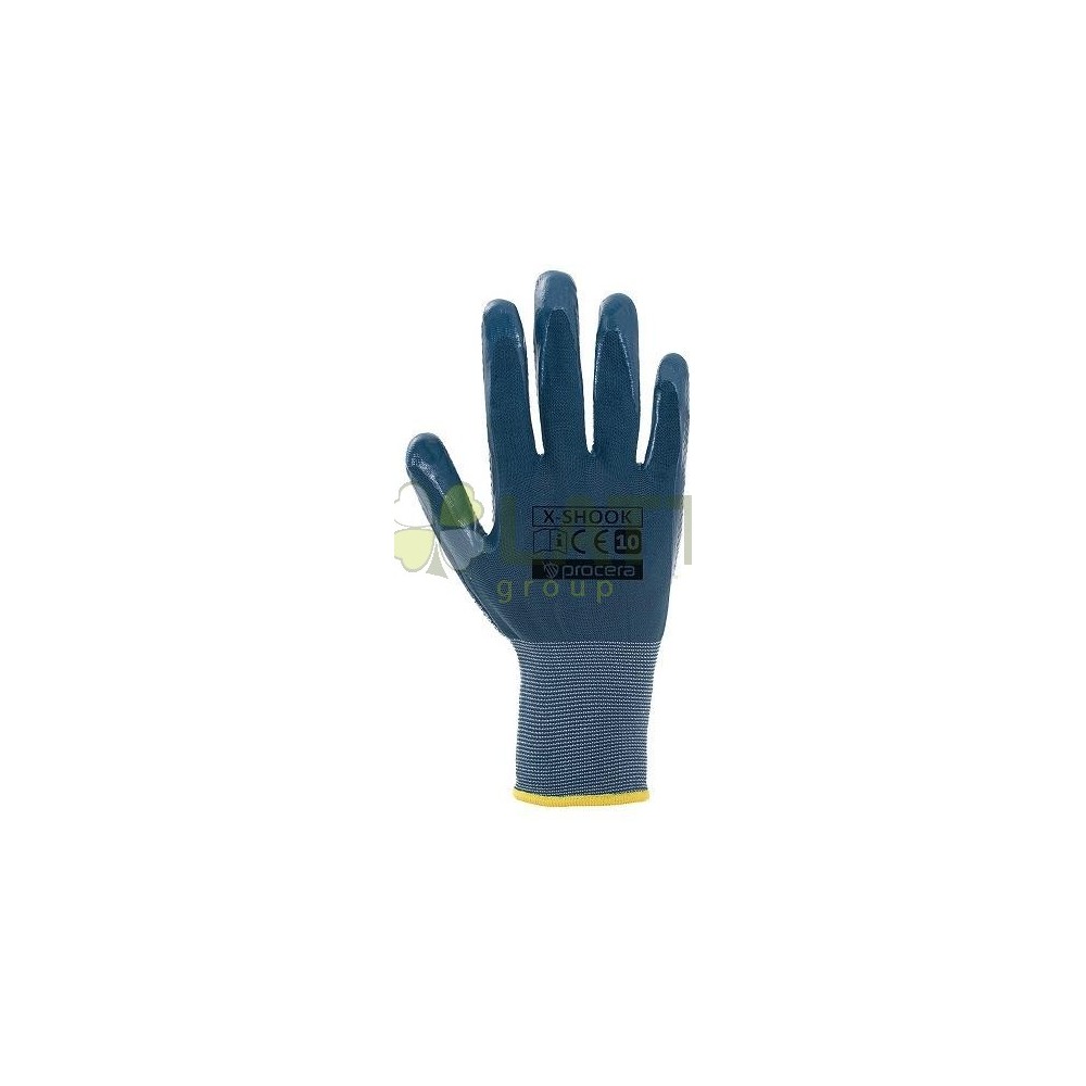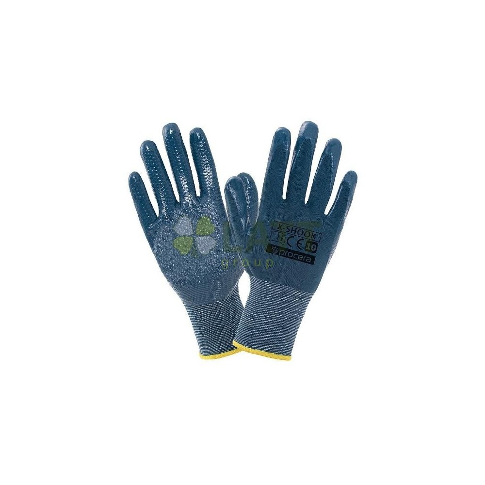 Pracovní rukavice X-SHOOK vyrobené z nylonu, potažené hladkým nitrilem odolným vůči olejům a tukům, tekutinám a nečistotám, s dodatečnou "diamand" strukturou ve vnitřní části, která zlepšuje přilnavost. Vyrobeno z nylonu zaručuje zvýšenou prodyšnost rukavic a pohodlí při práci. Dobře se přizpůsobí tvaru ruky. Elastický lem. Určeno pro mechanické, dopravní, údržbářské, opravárenské, stavební a jiné práce. Balení: karton 12/120. Barva: šedá/černá. EN420, Kategorie I
