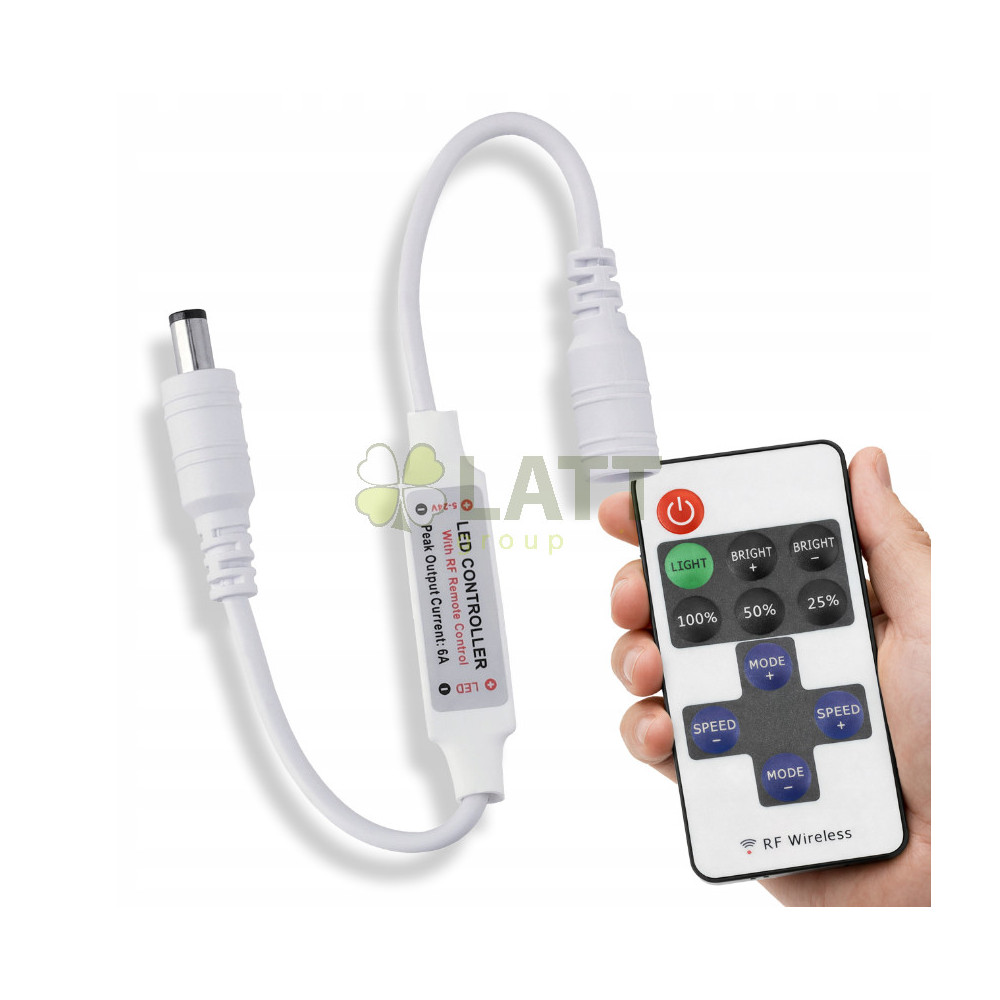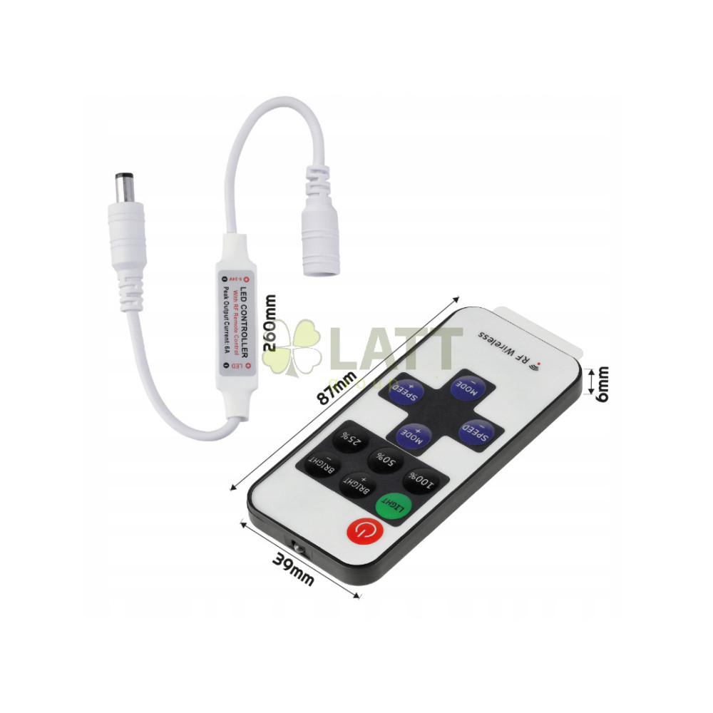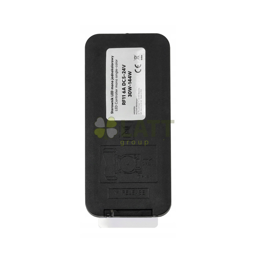 ⚙️ Dane techniczneTyp: sterownik / ściemniacz LED MONO Sterowanie: RF – pilot radiowy Liczba przycisków pilota: 11 Napięcie zasilania: DC 5–24V Napięcie wyjściowe: 12–24V DC Maksymalny prąd wyjściowy: 6A Maksymalna moc: 72W przy 12V 144W przy 24V Stopień szczelności: IP20 Bateria w zestawie: Tak |
