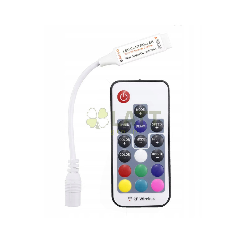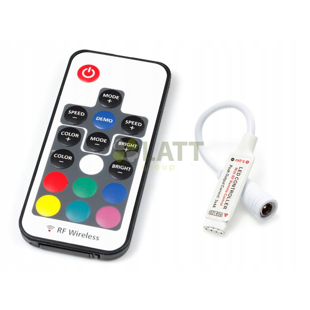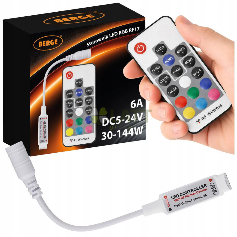 ⚙️ Dane techniczneTyp: sterownik / kontroler LED RGB Model: RF17 Sterowanie: RF – pilot radiowy Liczba przycisków pilota: 17 Napięcie zasilania: DC 5–24V Maksymalny prąd wyjściowy: 6A Maksymalna moc: 72W (12V) 144W (24V) Obsługiwane źródła światła: taśmy LED RGB (3-kanałowe) Zasięg pilota: do 20 m Stopień szczelności: IP20 |