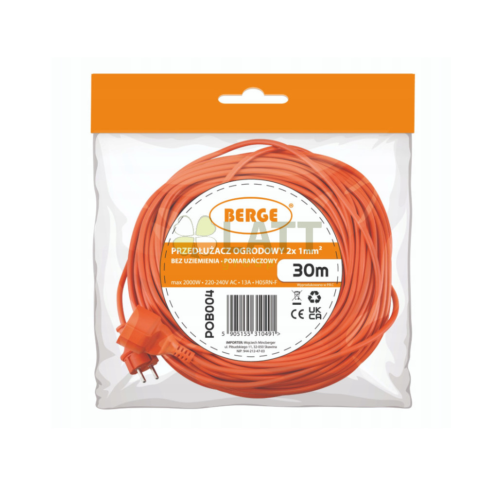 Technické údaje:Model:Zahradní prodlužovací kabel 30 m Drát:H05RN-F 2*1,0 mm2 Délka kabelu:30 metrů Počet zásuvek:1x Parametry kabelu:13A 220V - 240V AC IP65 Parametry pluginu:16A 220V - 240V AC IP44 Maximální výkon:2000 W |