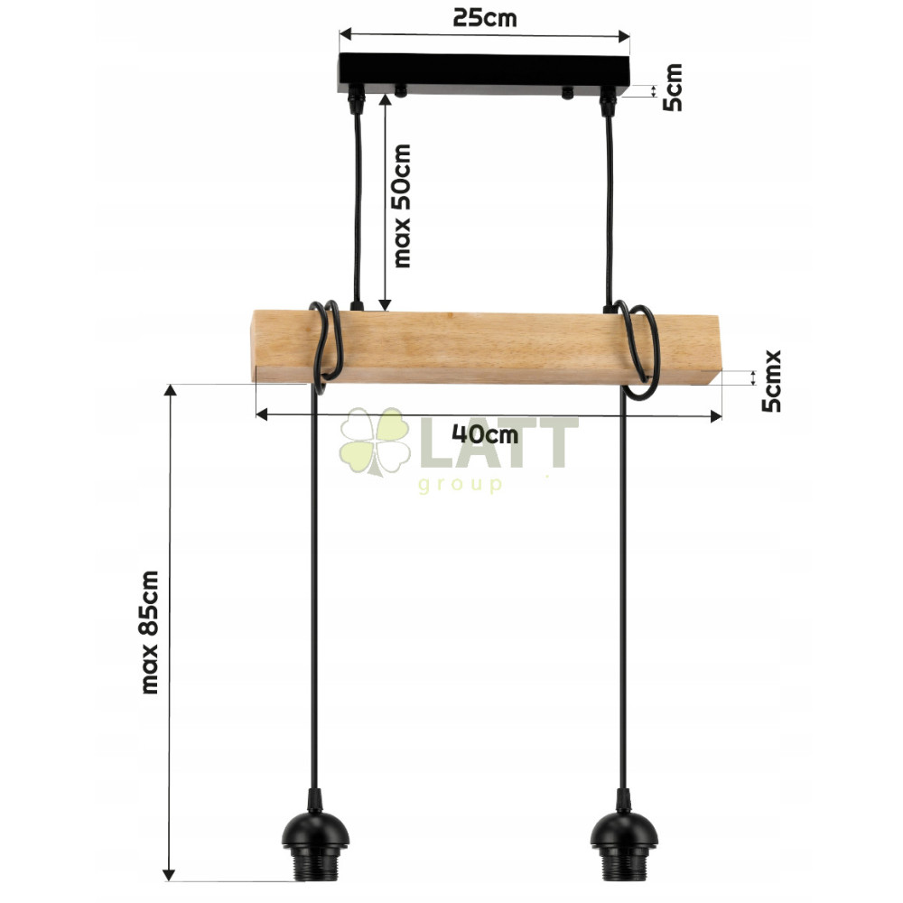 Technické údaje: Napájecí napětí : 230V Světelný zdroj : 2 x E27 (žárovky nejsou součástí sady) Lampa má držáky, na které lze přišroubovat stínidla lampy (kupují se samostatně) Základní materiál : Ocel + dřevo Barva uchycení : Černá Maximální výkon jedno světlo zdroj : 60W (wolframové žárovky) / 20W (LED) Certifikáty : CE, RoHS Další vlastnosti : Vestavěná montážní kostka pro snadné připojení, nastavení výšky pomocí kabelů a nosníku