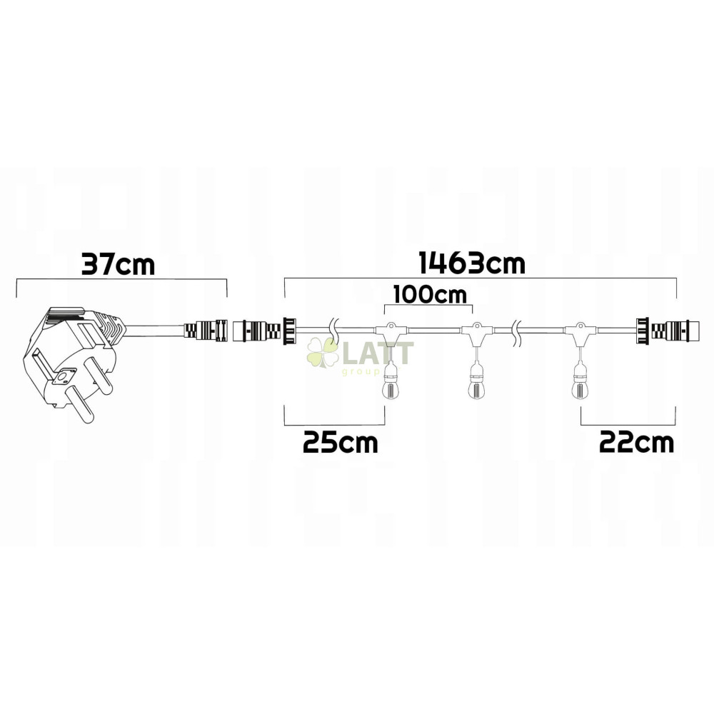Model: Zahradní girlanda Délka: 15 metrů Vzdálenost mezi cibulkami: 100 cm Možnost kombinace girland: Ano! Třída těsnosti: IP44 Napájecí napětí: 230V Další vlastnosti: Držák pro montáž na lano nad žárovky.