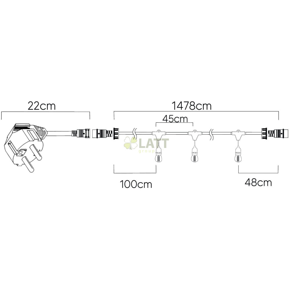 Model: Zahradní girlanda Délka: 15 metrů Vzdálenost mezi cibulkami: 45 cm Možnost kombinace girland: Ano! Třída těsnosti: IP44 Napájecí napětí: 230V Další vlastnosti: Držák pro montáž na lano nad žárovky.