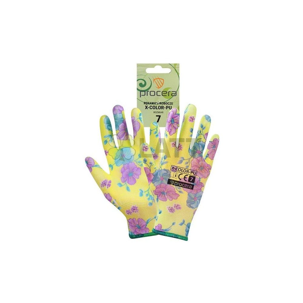 Rukavice X-COLOR vyrobené z polyesterové pleteniny potažené polyuretanem. Pružné a elastické, přizpůsobí se tvaru ruky. Vynikající pocit z držených předmětů. Zajímavé barvy a design. Určeno pro zahradnické, ruční, kontrolní, strojní, dopravní, výrobní a jiné práce. EN21420:2020. Velikosti: 6, 7, 8, 9. Balení: karton 12/240.