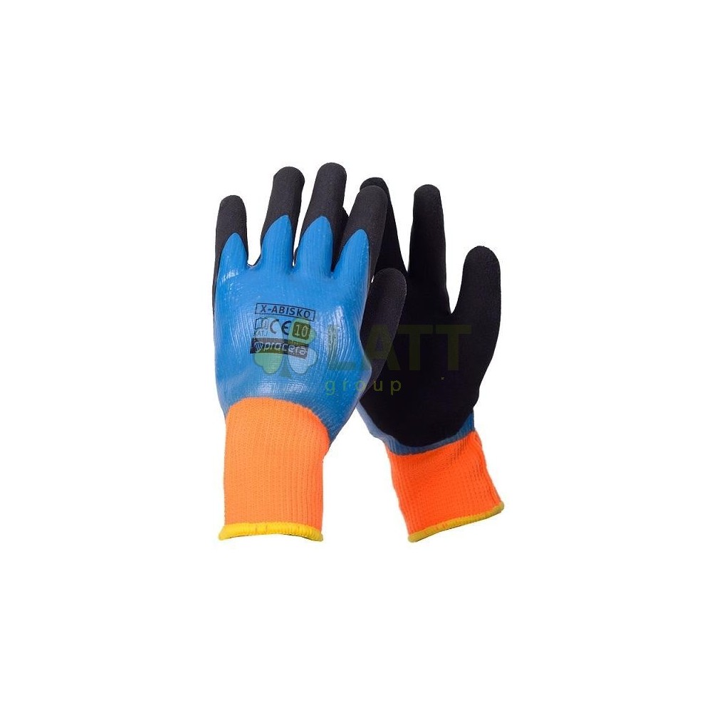 Rukavice X-ABISKO jsou vyrobeny ze zateplené polyesterovo-bavlněné tkaniny v oranžové barvě, dvojitě potažené vrstvou hladkého latexu a latexové pěny v úchopové části a celé prsty v hřbetní části. Ideální pro práci při nízkých teplotách, také ve vlhkém prostředí. Velmi dobrá přilnavost. Vysoká odolnost proti oděru. Ukončeno lemem. CE EN 420 Balení: karton 12/120. Barva: oranžová/modrá/černá.
